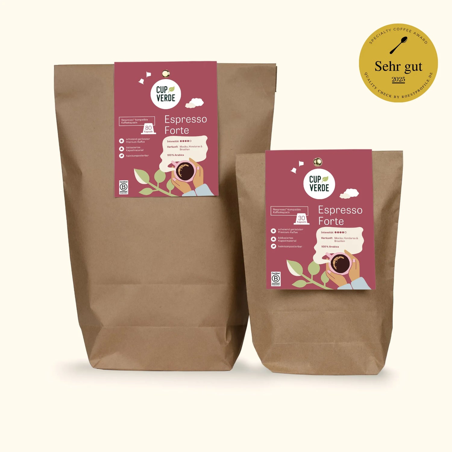 Klein und stark – das ist unser Espresso Forte. Unsere kräftige Mischung für besonders vollmundigen Geschmack ist perfekt nach dem Essen oder einfach für zwischendurch. Dafür verwenden wir ausgesuchte Arabica-Bohnen aus Brasilien, Mexiko und Honduras – für den Aroma-Kick in der Tasse. Unsere Kaffeekapseln aus nachwachsenden Rohstoffen kommen ohne Plastik oder Aluminium aus. Bedruckt mit Cellulose-Farben und mit einem Deckel aus Papier sind sie außerdem komplett biologisch abbaubar. Bitte informiere Dich über die fachgerechte Entsorgung der Kapseln bei Deinem zuständigen Abfall- Entsorgungsunternehmen.