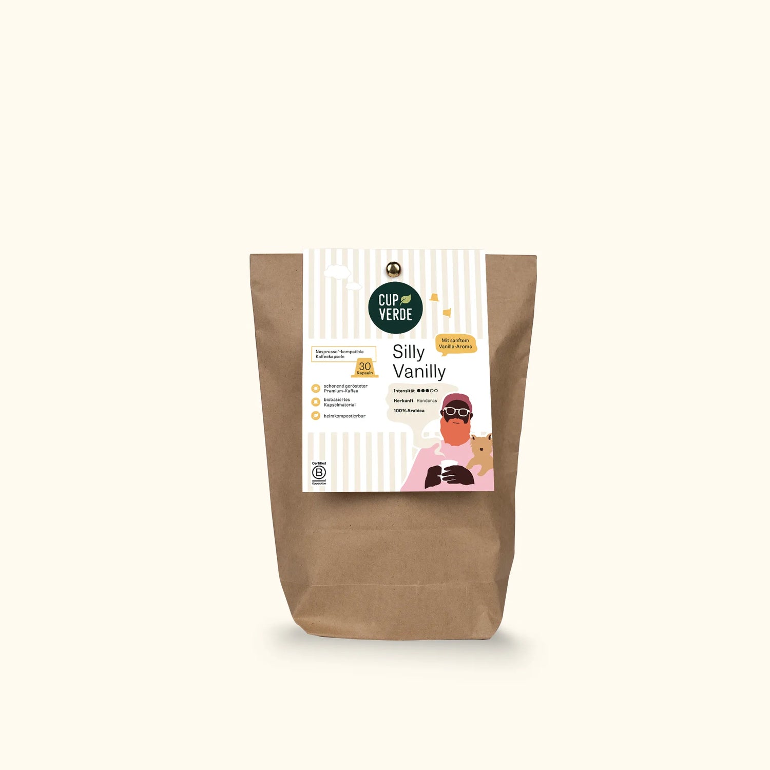 Silly Vanilly ist die köstliche Kombination von besten Arabica-Bohnen aus Honduras mit einem sanften Vanille-Aroma. Durch eine schonende Trommel-Röstung erreichen wir den unvergleichlich feinen Geschmack. Unsere Aromen sind frei von tierischen Inhaltsstoffen und Allergenen.