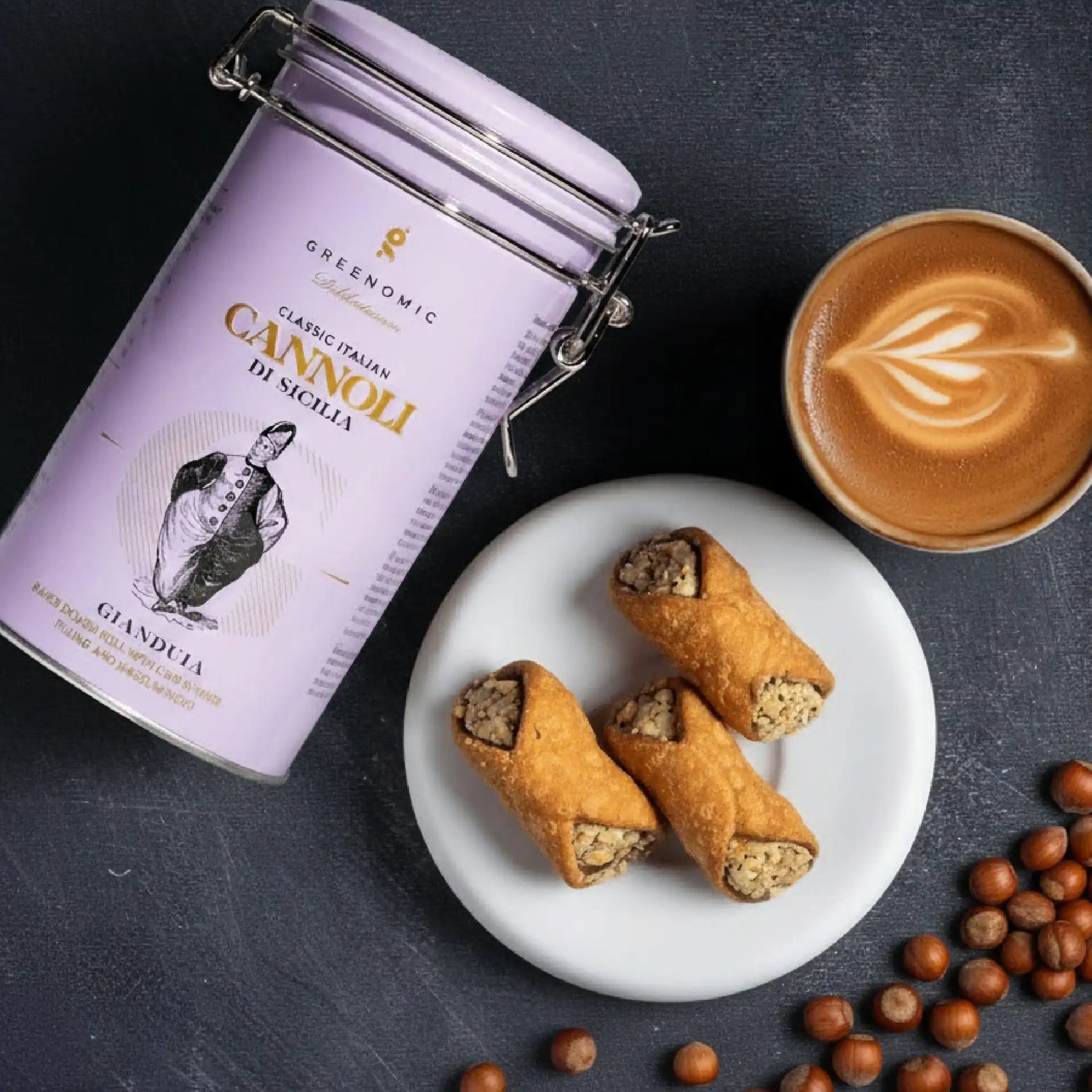 Cannoli di Sicilia Fleur de Sel & Caramel: Weizenmehl, Puderzucker, Margarine, Wein (Sulfite), Eier, Kakao, Salz, Zucker, pflanzliche Öle (Sonnenblume, Kokosnuss, Palm), 35% Karamell [(Zucker, Butter, pflanzliche Fette (Kokosnuss, Palm), Kakaobutter, Milcheiweiß, Lecithin (Soja), 3% Meersalz, Aromen)], Milch, Kakaobutter, Maltodextrin, Emulgator: Lecithin (Soja), 1,5% Erdnussmehl. Kann Spuren von Nüssen, Gluten, Milch und Soja enthalten. Hergestellt in Italien. ALLERGENE: GLUTEN, NÜSSE, MILCH, SOJA, SESAM UND EIERN