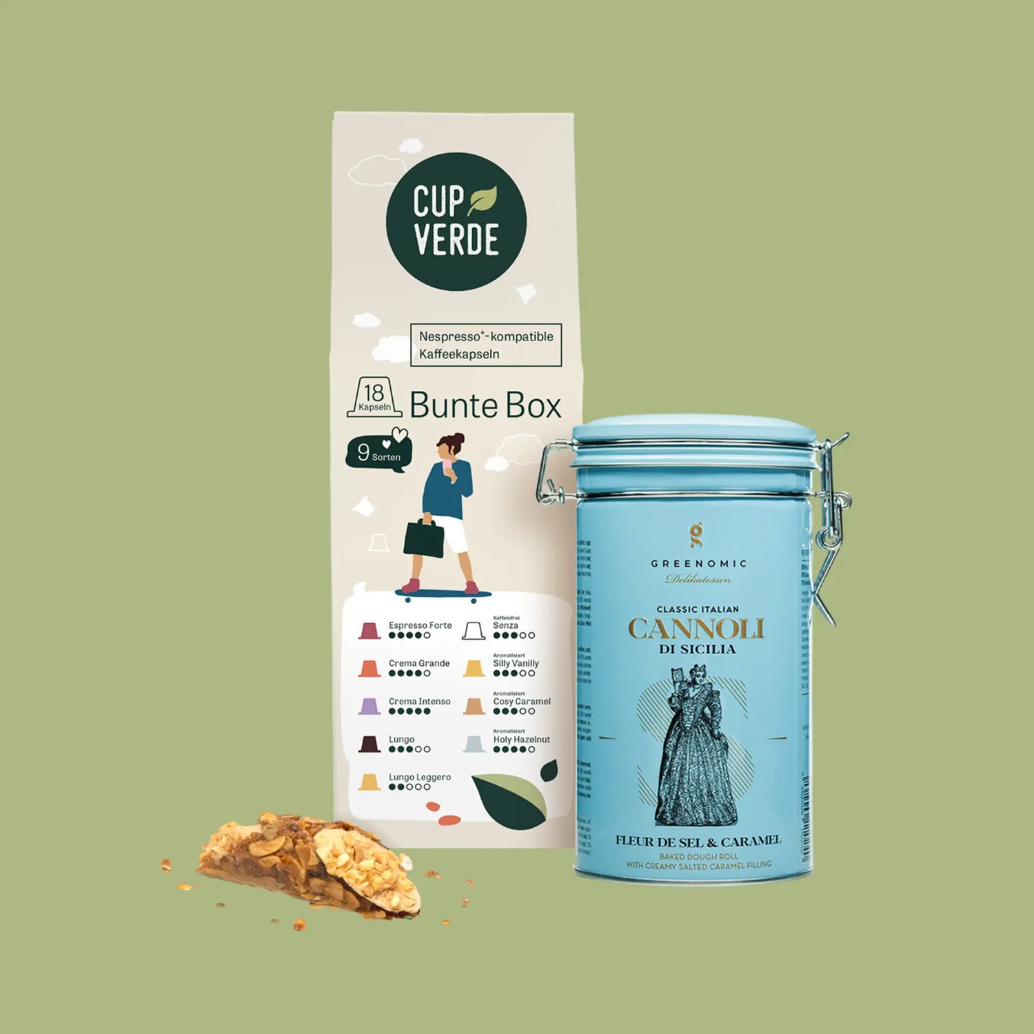 Cannoli di Sicilia Fleur de Sel & Caramel: Weizenmehl, Puderzucker, Margarine, Wein (Sulfite), Eier, Kakao, Salz, Zucker, pflanzliche Öle (Sonnenblume, Kokosnuss, Palm), 35% Karamell [(Zucker, Butter, pflanzliche Fette (Kokosnuss, Palm), Kakaobutter, Milcheiweiß, Lecithin (Soja), 3% Meersalz, Aromen)], Milch, Kakaobutter, Maltodextrin, Emulgator: Lecithin (Soja), 1,5% Erdnussmehl. Kann Spuren von Nüssen, Gluten, Milch und Soja enthalten. Hergestellt in Italien.