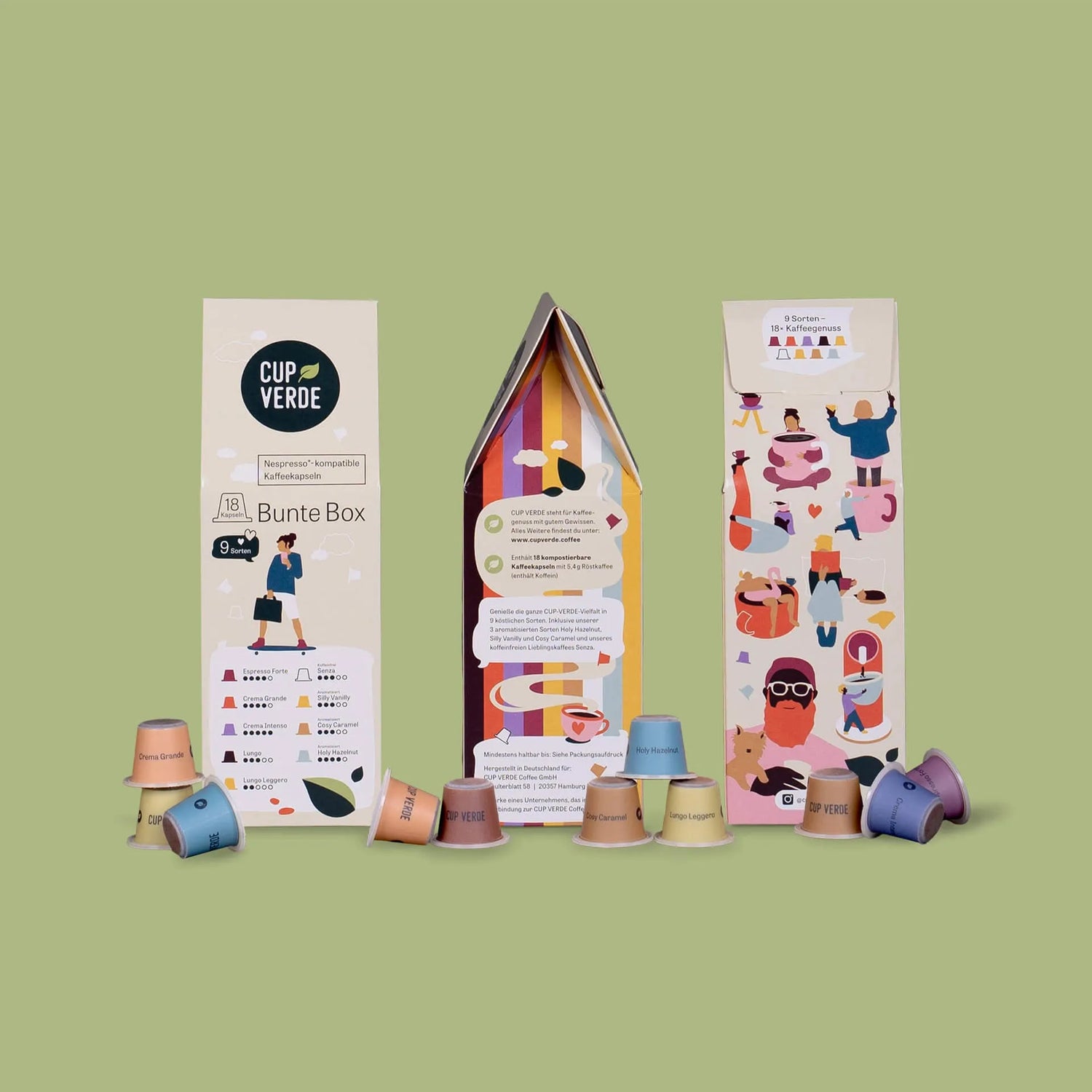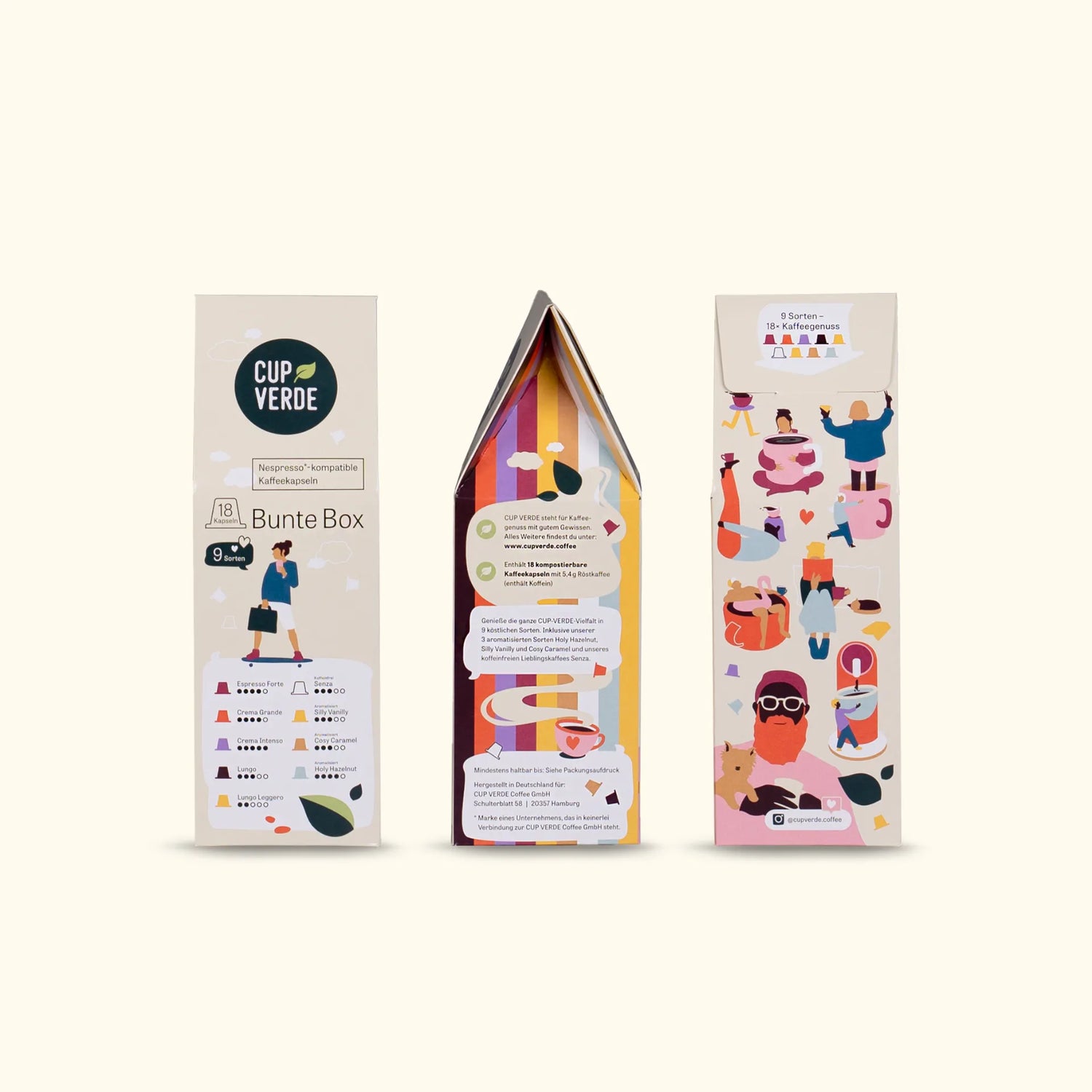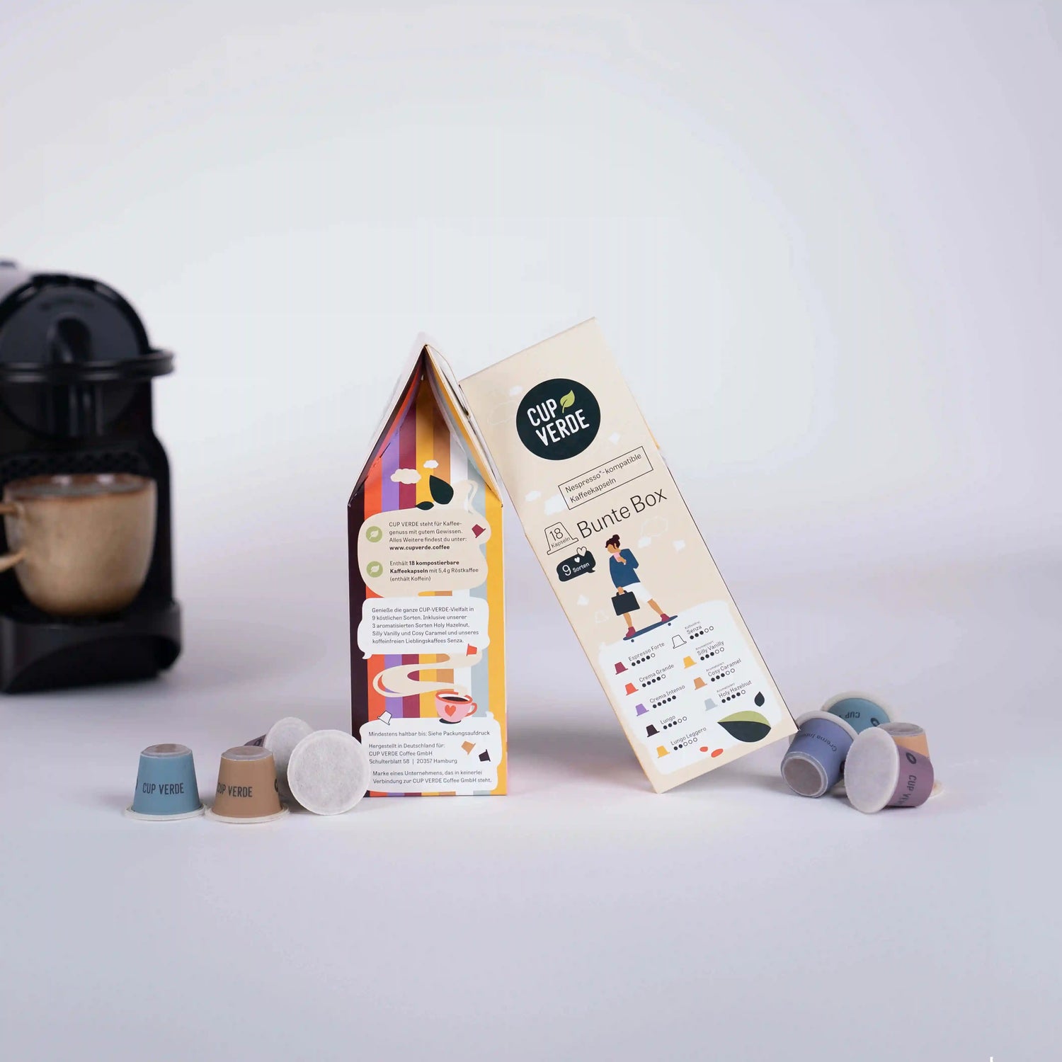 Entdecke die Welt von CUP VERDE mit unserer neuen Probierbox – 18 Kapseln und 9 verschiedene Sorten. Lass dich von den verschiedenen Aromen verführen und finde deinen persönlichen Lieblingssorte.