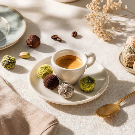 Unsere Trüffelpralinen sind das perfekte kleine Extra zu deinem Kaffee. Drei Sorten, die man einfach lieben muss: herber Kakao, feine Haselnuss und aromatische Pistazie. Zart-cremig, rund im Geschmack und genau das Richtige für einen kleinen Genussmoment – ob als Geschenk oder zum Selbstgenießen.